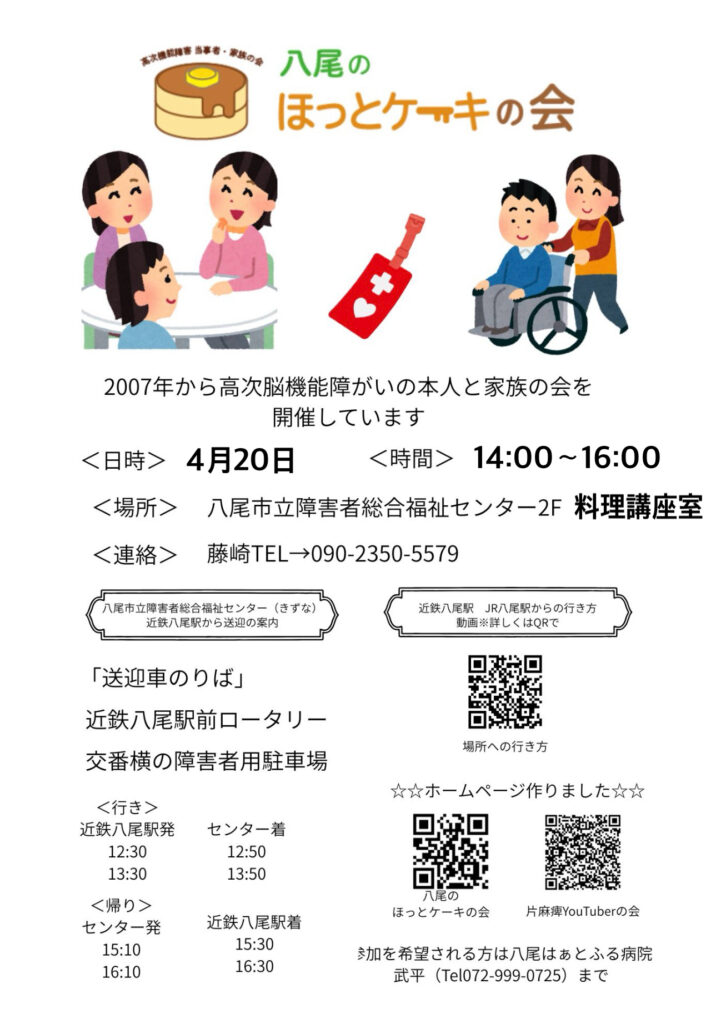交通事故やスポーツ等、外傷性脳損傷や脳梗塞、脳出血、くも膜下出血など脳損傷による後遺症(高次脳機能障害)を負った当事者と家族の会が大阪府各地に出来、これらの会の連合組織の1つが「八尾のほっとケーキの会」です。